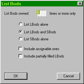 The number in the last column of each row tells you how many times you own the particular Bod. The options "List LBods alone", "List LBods and SBods" und "List SBods alone" should be self-explaining. |