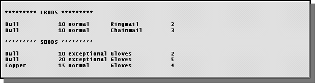 The default is "2", "don't include assignable ones" and "don't list partially filled Lbods", which basically means that you get a listing of Bods that you own at least twice, cannot combine with anything you have, and that are empty (if LBods). In short -the right list of Bods to offer in a trade. Include assignable ones If marked, Bods that could be combined with other ones you own will be included. The default is "off" Include partially filled LBods If marked LBods that already have SBods incorporated will be included in the report. The default is "off" This is what the report looks like: