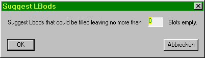 Taking a look at your SBods that cannot be assigned, the program suggests some LBods that you should try to get you hands on. You can fine tune how many Lbods the program suggest by specifying to what amount they have to be "fillable" in order to make it to the list. The default here is "0" blanks, which means that only Lbods you could fill completely are suggested. Entering a "1" here will add the Lbods that will still have one unfilled Slot, when all your suitable orphaned Sbods are integrated, etc. This is an example (one empty slot allowed)