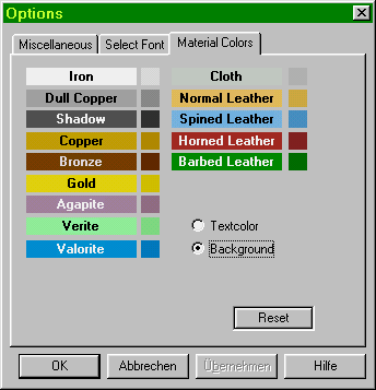Here you can adjust background and text colors to your personal liking. The small square fields are for adjusting the color of the unused space in the LBods sections with less than 6 different items. The button reverts to the default colors.You can always check you currently selected colors by using the "ColorCoding" icon   Although you can change colors here, throughout this documentation the default colors are used. |